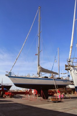 | Mangas (still Avalon at this point) during haul out for survey and bottom paint. Ladder doesn’t look that far, but eek! that was a long way down! |