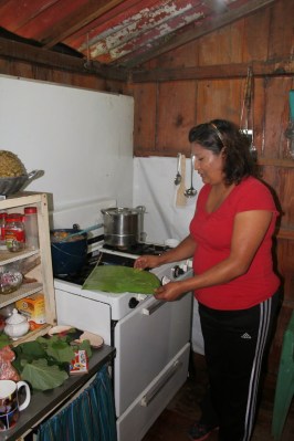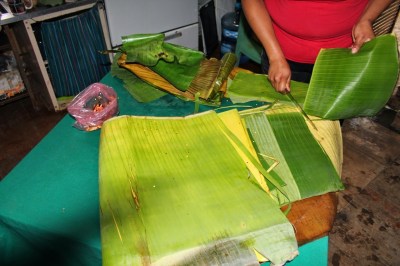 | Cutting the banana leafs to the right size for the tamales |