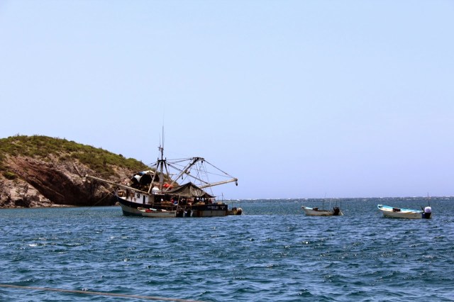 We return to the boat just in time to tie up the dinghy and sit out a chubasco that has built up in the afternoon. Chubasco’s are a result of the monsoon activity on shore and the blow it creates off shore can be quite a thing for boats. This particular chubasco seems to hit gusts of around 30 knots, sustaining winds of about 25 knots. I watch as a shrimp boat comes in from the sea to seek refuge from the winds and swells. It rocks ominously starboard to port and back again as it navigates into the bay.