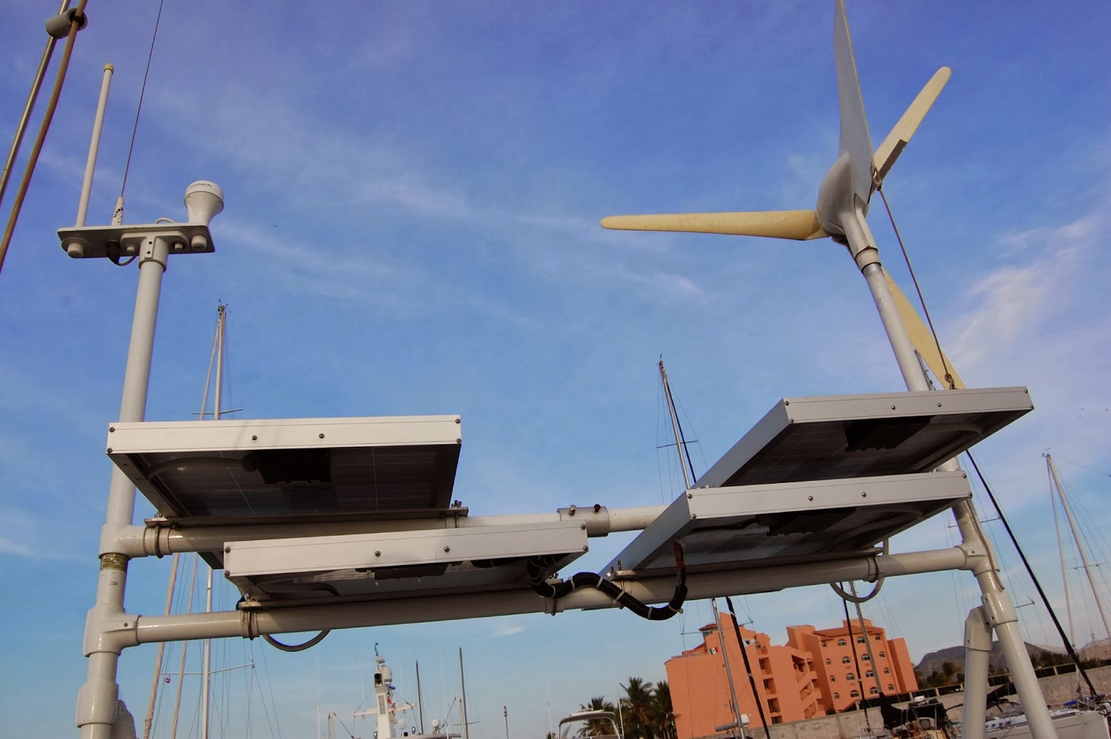 | Most excellent Solar and Wind Generator over the stern |